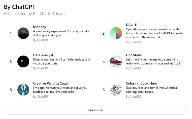 Some of the GPTs created by the ChatGPT team include a creative writing coach, a data analyst, and a coloring book maker. Think of custom GPTs like mini-applications inside ChatGPT.