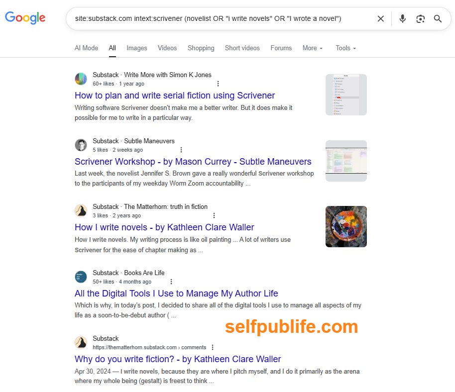 site:substack.com intext:scrivener (novelist OR “i write novels” OR “I wrote a novel”)And here is a screenshot of a sampling of the results in Google: