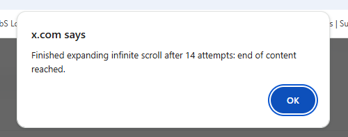 My intent was to use this for Substack at first, but it also works to some degree on Facebook, X, and Pinterest, although you may need to increase the number for the “SCROLL_INTERVAL” if it stops too early: