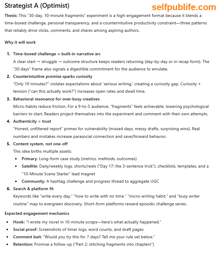 Slight edge to Strategist A—the concept has strong intrinsic engagement levers (time-box, counterintuitive constraint, honest data). However, the Skeptic rightly warns about saturation and the gap between attention and conversion. The idea is viable if it’s executed with sharper differentiation and measurable outcomes tied to audience goals.