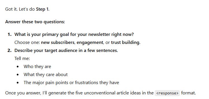 - What is your primary goal for this newsletter right now? (Options: new subscribers, engagement, trust building)